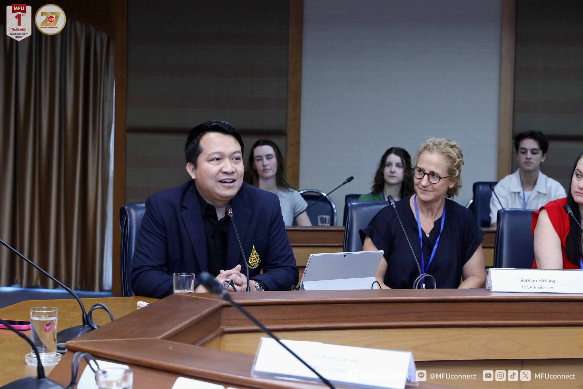 เมื่อวันที่ 2 กุมภาพันธ์ 2569 ผู้ช่วยศาสตราจารย์ ดร.มัชฌิมา นราดิศร อธิการบดีมหาวิทยาลัยแม่ฟ้าหลวง ให้การต้อนรับคณะผู้แทนจาก The University of Western Australia และ University of Oregon สหรัฐอเมริกา เพื่อหารือแนวทางความร่วมมือทางวิชาการด้านการบริหารจัดการสาธารณสุขข้ามพรมแดน ณ อาคารวันชัย ศิริชนะ มหาวิทยาลัยแม่ฟ้าหลวง