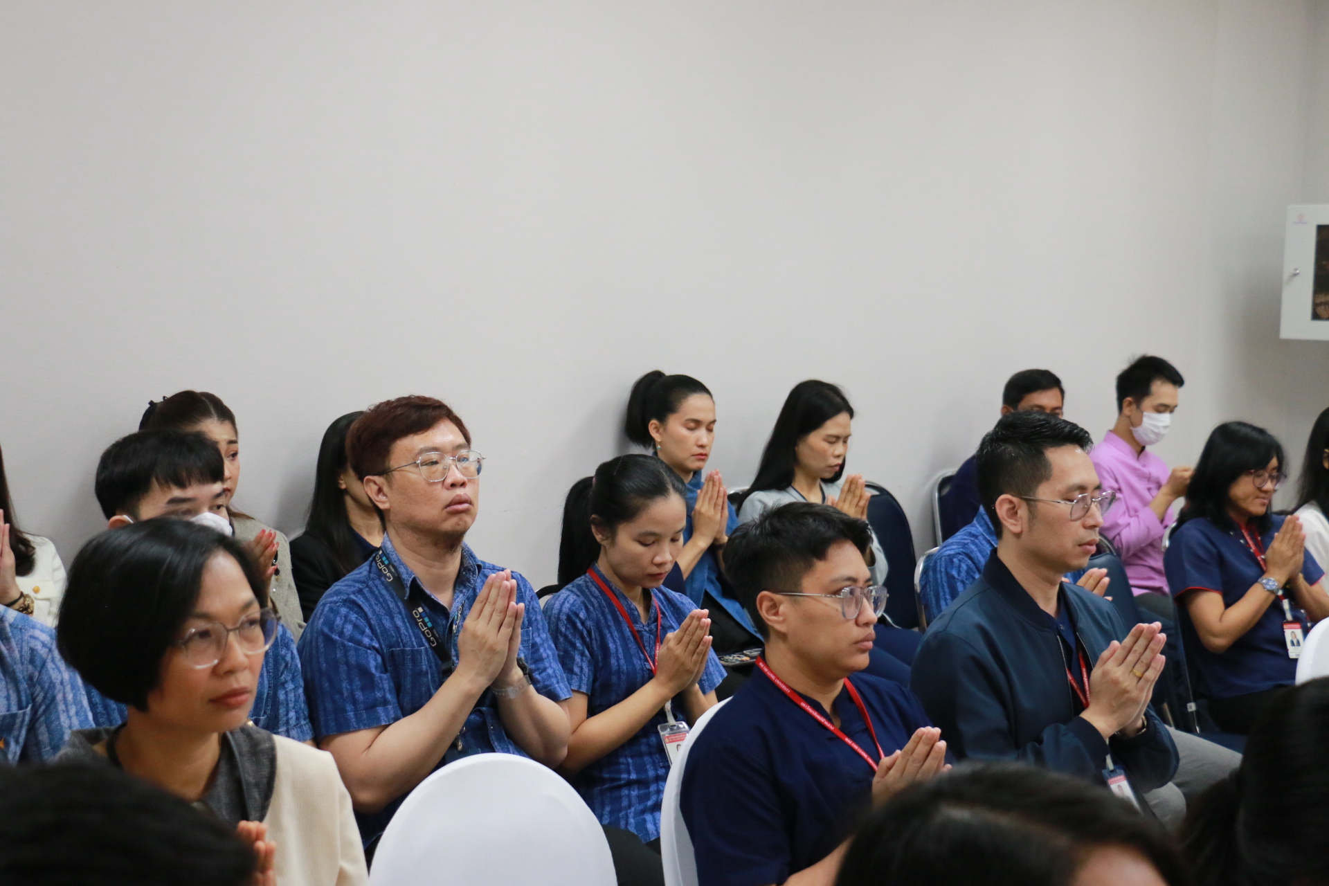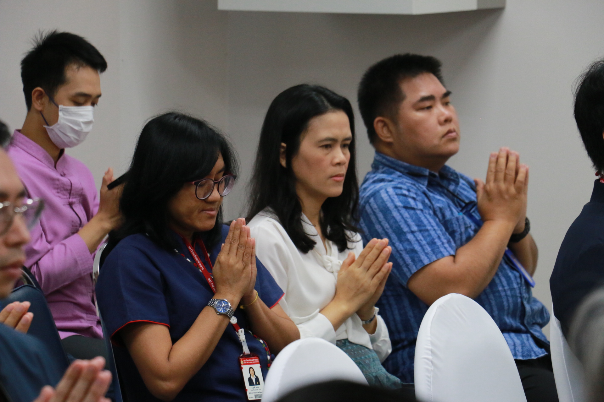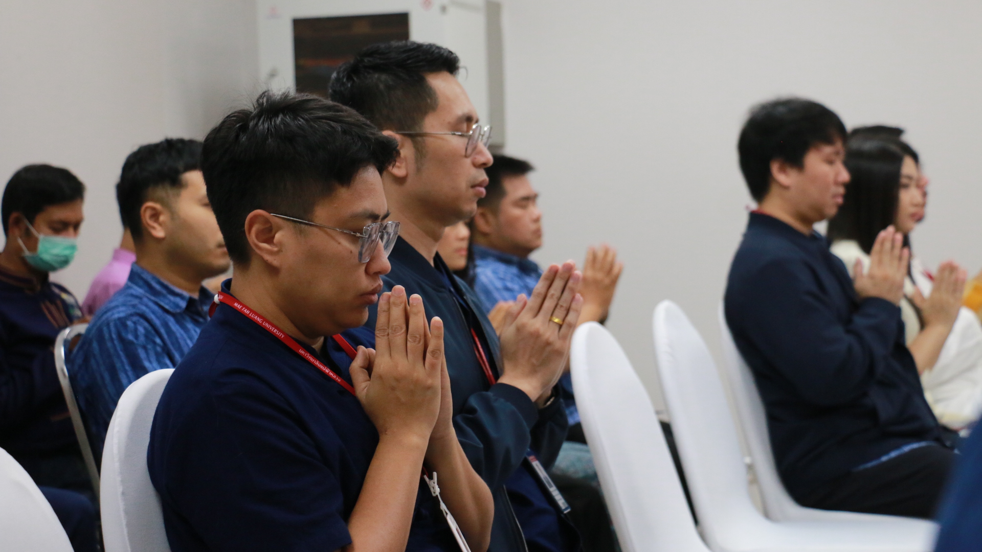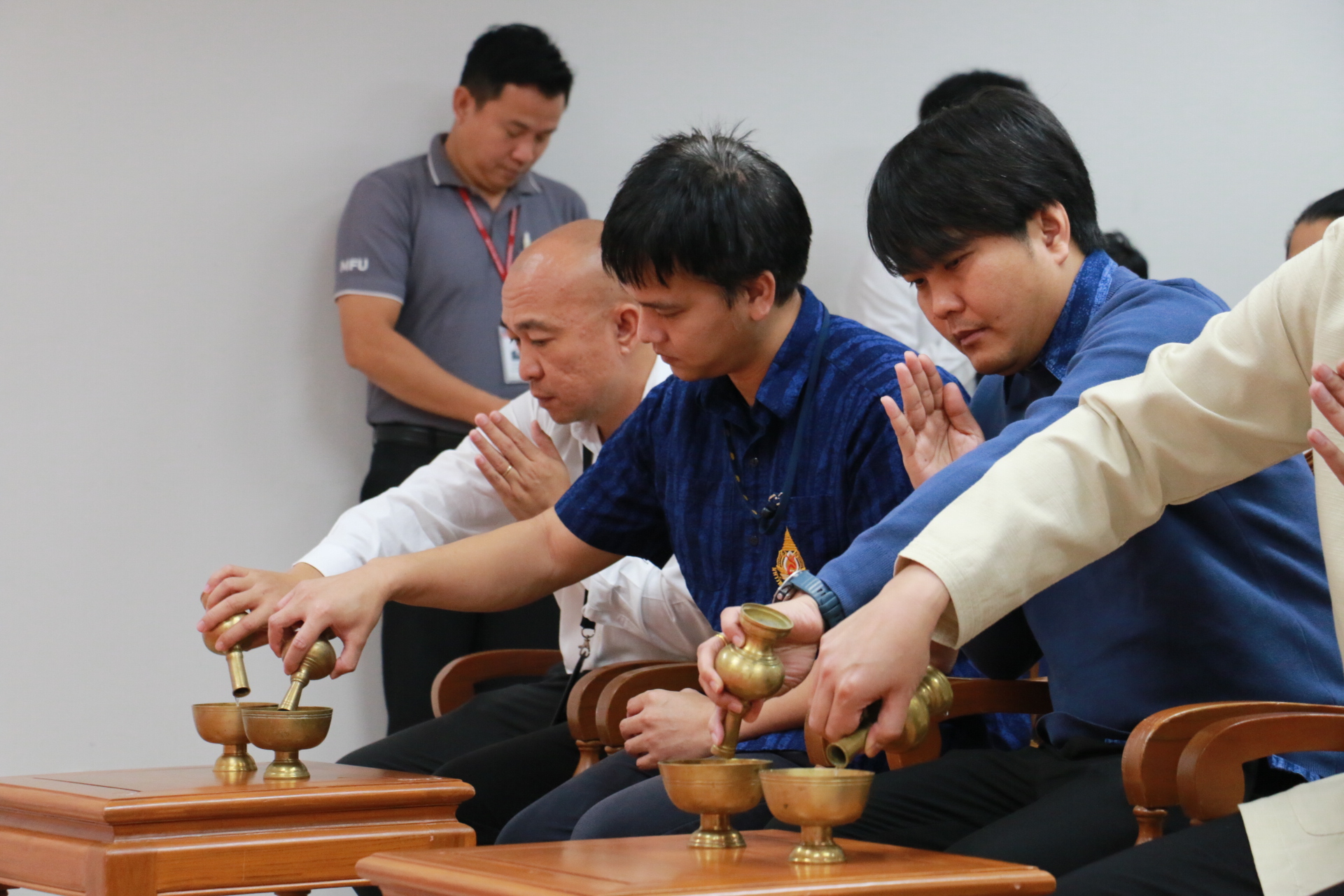 The ceremony included the offering of meals to Buddhist monks and the chanting of Buddhist prayers. Associate Professor Dr. Darunee Wattanasiriwech, Vice President of Mae Fah Luang University, graciously presided over the ceremony and led the lighting of incense in homage to the Triple Gem. Administrators, faculty members, staff, and students attended the ceremony in unity, creating a warm and auspicious atmosphere.