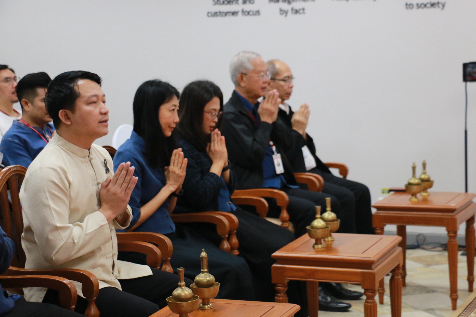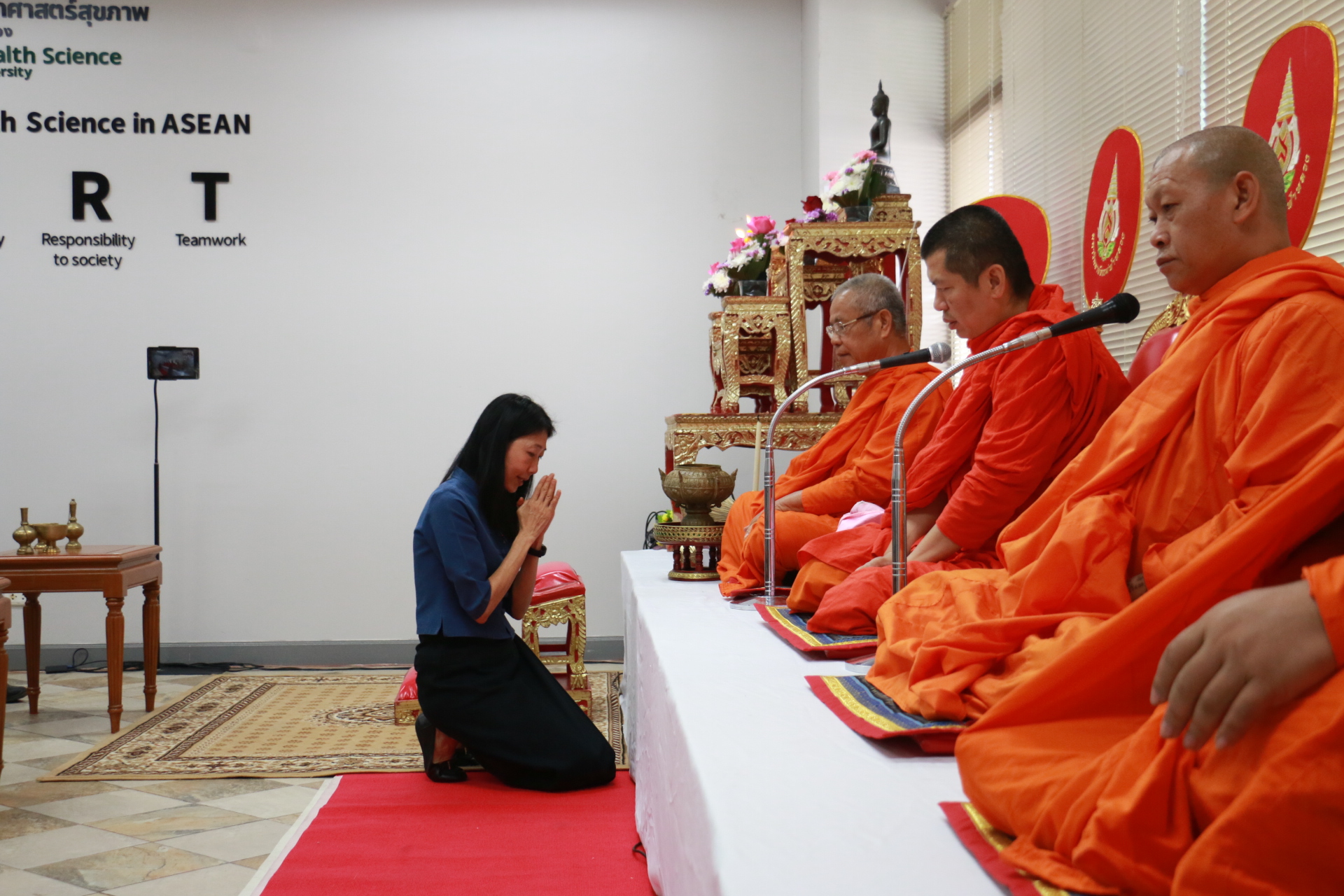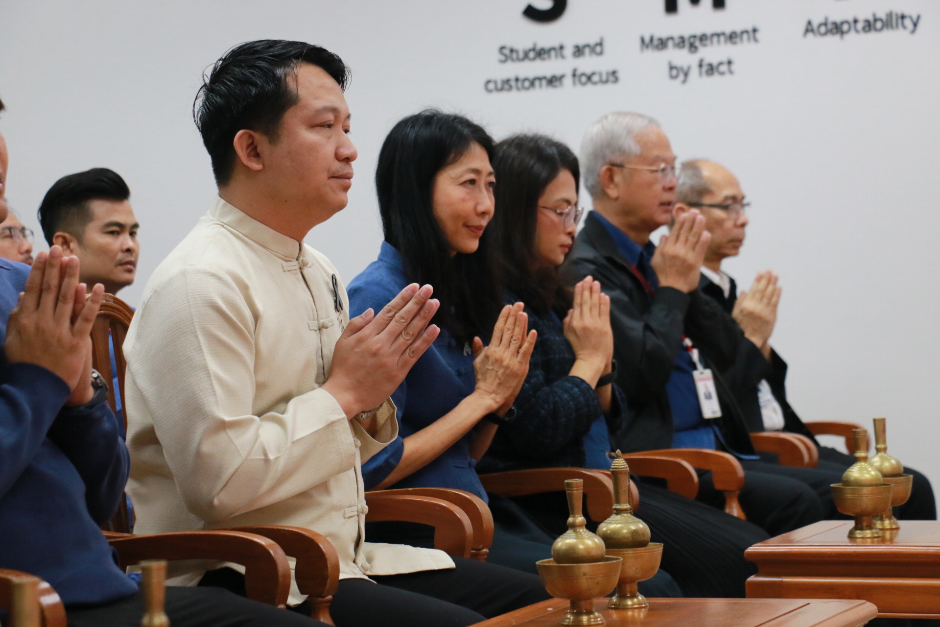 ภายในพิธี ประกอบด้วย การถวายภัตตาหารแด่พระสงฆ์ การสวดเจริญพระพุทธมนต์ โดยมี รศ. ดร.ดรุณี วัฒนศิริเวช (รองอธิการบดี) ให้เกียรติเป็นประธานจุดธูปบูชาพระรัตนตรัย และมีผู้บริหาร คณาจารย์ บุคลากร และนักศึกษาเข้าร่วมพิธีอย่างพร้อมเพรียง ท่ามกลางบรรยากาศแห่งความอบอุ่นและความเป็นสิริมงคล
