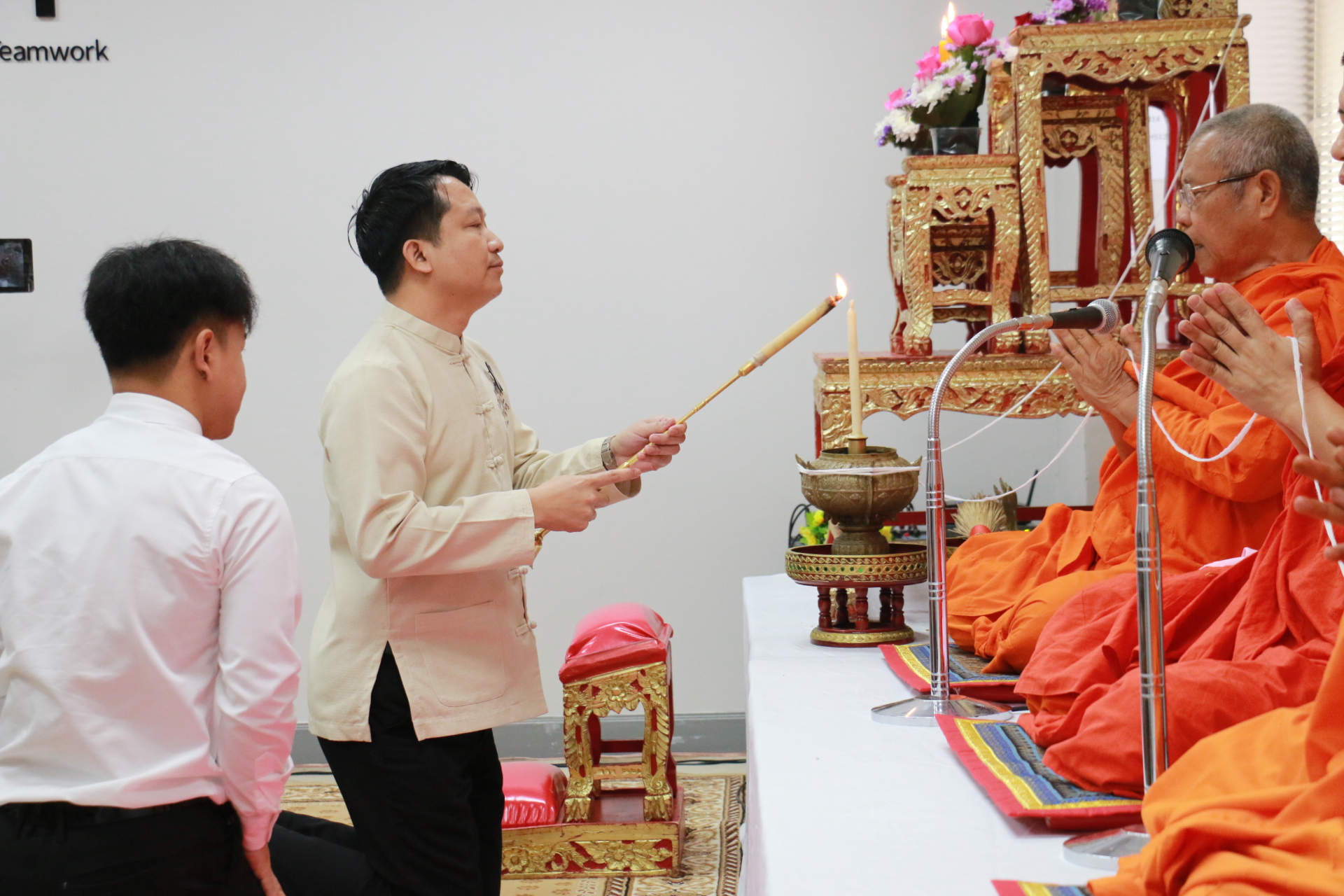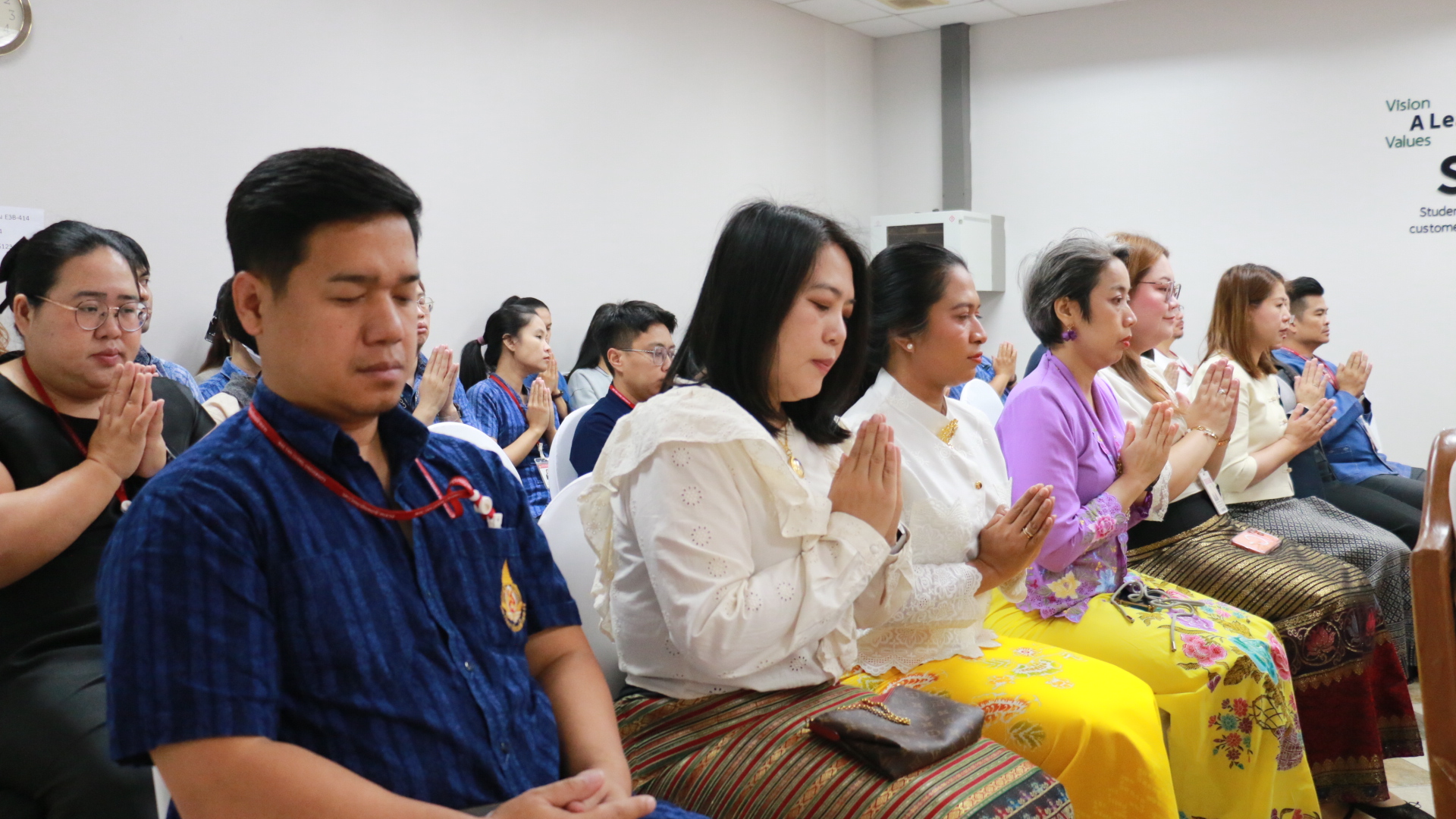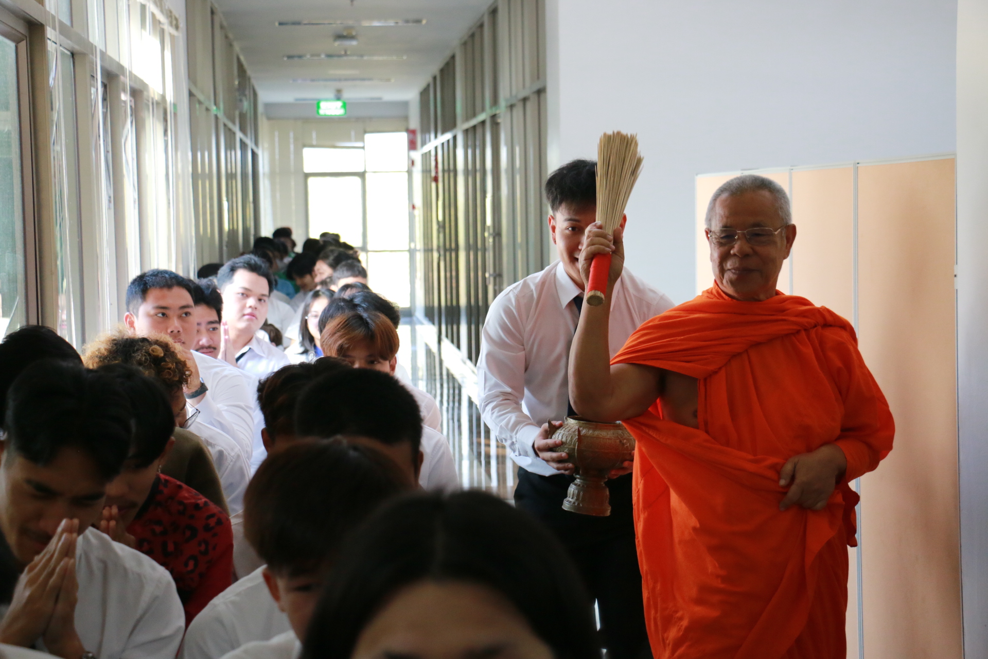 ภายในพิธี ประกอบด้วย การถวายภัตตาหารแด่พระสงฆ์ การสวดเจริญพระพุทธมนต์ โดยมี รศ. ดร.ดรุณี วัฒนศิริเวช (รองอธิการบดี) ให้เกียรติเป็นประธานจุดธูปบูชาพระรัตนตรัย และมีผู้บริหาร คณาจารย์ บุคลากร และนักศึกษาเข้าร่วมพิธีอย่างพร้อมเพรียง ท่ามกลางบรรยากาศแห่งความอบอุ่นและความเป็นสิริมงคล