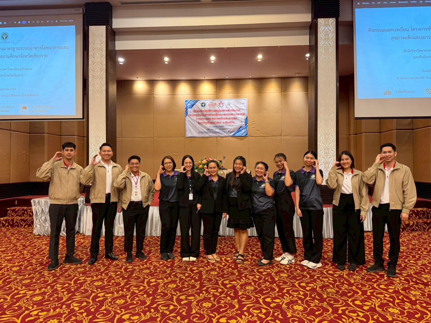 เมื่อวันที่ 2 เมษายน 2569 ที่ผ่านมา สำนักวิชาวิทยาศาสตร์สุขภาพ โดยคณาจารย์จากสาขาวิชาสาธารณสุขศาสตร์ นำโดย ผู้ช่วยศาสตราจารย์ ดร.พีรดนย์ ศรีจันทร์ ผู้ช่วยศาสตราจารย์อนุสรณ์ อุดปล้อง ผู้ช่วยศาสตราจารย์รติภาคย์ ตามรภาค อาจารย์ธนัชพร มุลิกะบุตร และอาจารย์ชลิตา ชมเชย เข้าร่วมเป็นวิทยากรและร่วมกิจกรรมถอดบทเรียน ภายใต้โครงการขับเคลื่อนมาตรฐานระบบอาหาร โภชนาการ และสุขภาพเด็กและเยาวชนในสถานศึกษา ของจังหวัดเชียงราย ซึ่งดำเนินการโดยสำนักงานสาธารณสุขจังหวัดเชียงราย ณ ห้องประชุมบุษราคัม โรงแรมวังคำ จังหวัดเชียงราย
