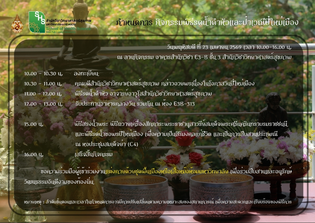 สำนักวิชาวิทยาศาสตร์สุขภาพ มหาวิทยาลัยแม่ฟ้าหลวง ขอเรียนเชิญคณาจารย์ บุคลากร และตัวแทนนักศึกษา เข้าร่วมโครงการสืบสานประเพณีและวัฒนธรรมล้านนา ในกิจกรรม “พิธีรดน้ำดำหัวและป๋าเวณีปี๋ใหม่เมือง” ประจำปี พ.ศ. 2569 ซึ่งจะจัดขึ้นใน วันพฤหัสบดีที่ 23 เมษายน 2569 ณ ลานกิจกรรม อาคารสำนักวิชา 3 (E3) ตึก B ชั้น 3 เพื่อร่วมแสดงความกตัญญูกตเวทีต่ออาจารย์อาวุโสและรักษาธรรมเนียมปฏิบัติอันดีงามของชาวล้านนาให้คงอยู่สืบไป